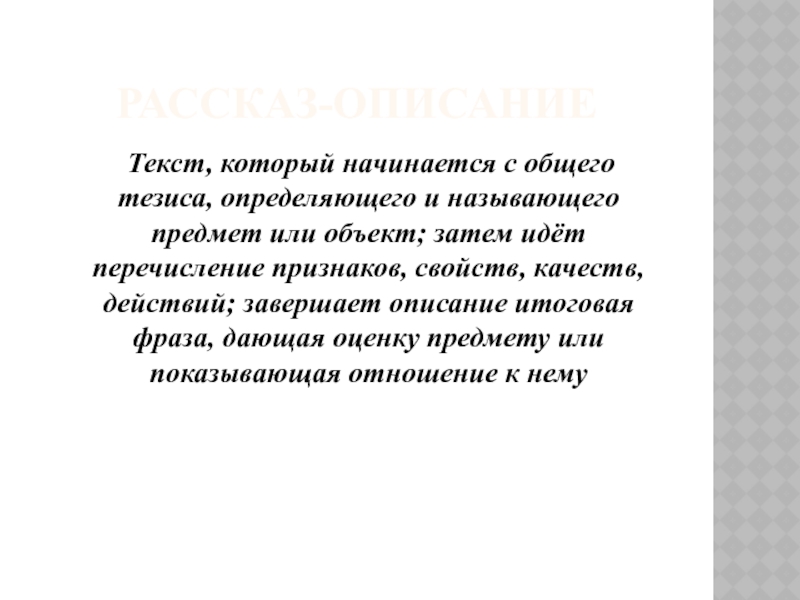 предмет или объект; затем идёт перечисление признаков, свойств, качеств, действий; завершает описание итоговая фраза, дающая оценку предмету или показывающая отношение к нему