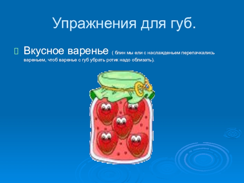 Упражнения для губ.Вкусное варенье ( блин мы ели с наслажденьем перепачкались вареньем, чтоб варенье с губ убрать