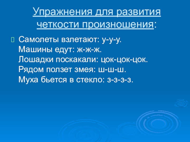Упражнения для развития четкости произношения:Самолеты взлетают: у-у-у. Машины едут: ж-ж-ж. Лошадки поскакали: цок-цок-цок. Рядом ползет змея: ш-ш-ш.
