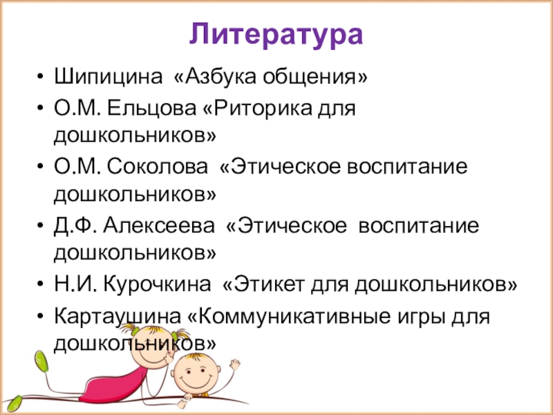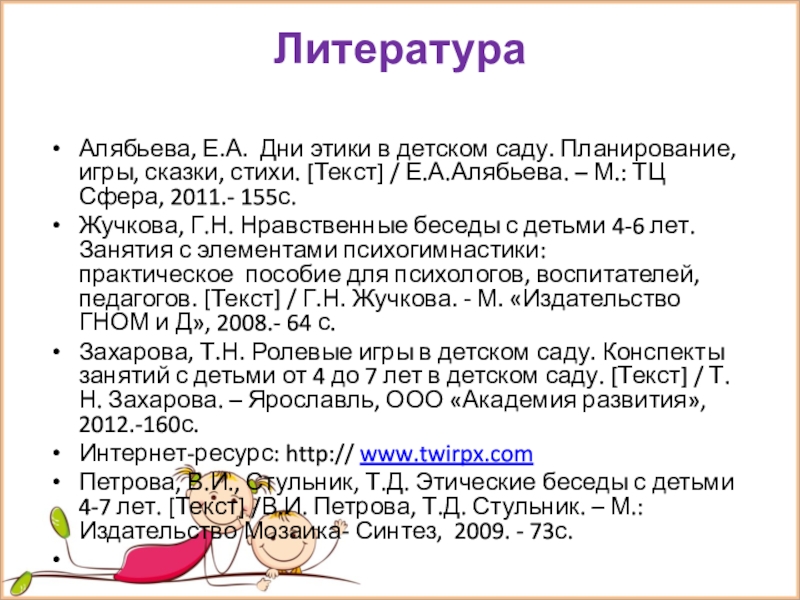 Жучкова, Г.Н. Нравственные беседы с детьми 4-6 лет. Занятия с элементами психогимнастики: практическое пособие для психологов, воспитателей, педагогов. [Текст] / Г.Н. Жучкова. - М. «Издательство ГНОМ и Д», 2008.- 64 с.