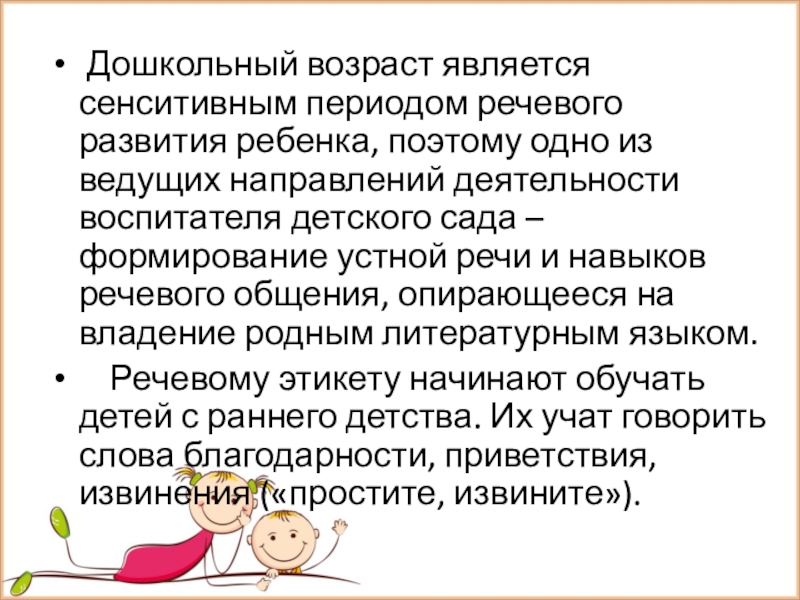 Слайд 8 Дошкольный возраст является сенситивным периодом речевого развития ребенка, поэтому одно
