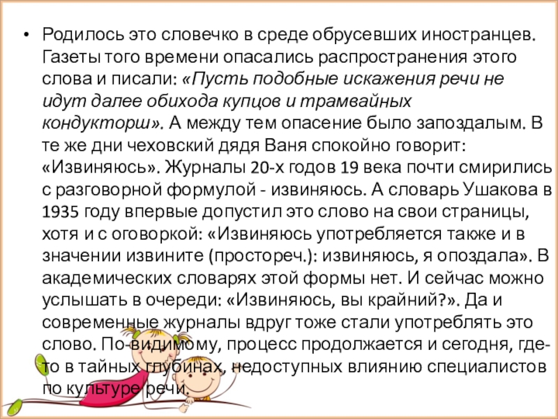 распространения этого слова и писали: «Пусть подобные искажения речи не идут далее обихода купцов и трамвайных кондукторш». А между тем опасение было запоздалым. В те же дни чеховский дядя Ваня спокойно говорит: «Извиняюсь». Журналы 20-х годов 19 века почти смирились с разговорной формулой - извиняюсь. А словарь Ушакова в 1935 году впервые допустил это слово на свои страницы, хотя и с оговоркой: «Извиняюсь употребляется также и в значении извините (простореч.): извиняюсь, я опоздала». В академических словарях этой формы нет. И сейчас можно услышать в очереди: «Извиняюсь, вы крайний?». Да и современные журналы вдруг тоже стали употреблять это слово. По-видимому, процесс продолжается и сегодня, где-то в тайных глубинах, недоступных влиянию специалистов по культуре речи.