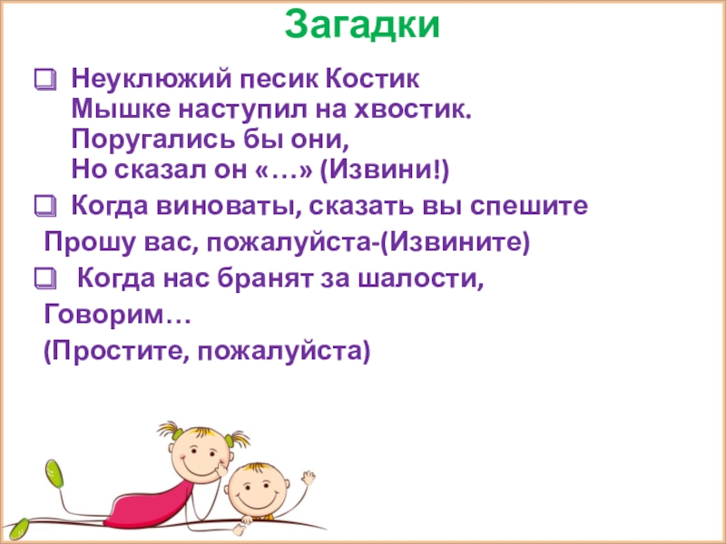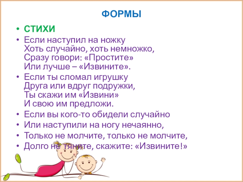 Речевому этикету начинают обучать детей с раннего детства. Их учат говорить слова благодарности, приветствия, извинения («простите, извините»).