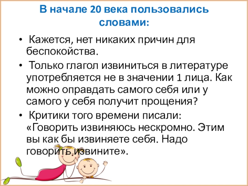 Критики того времени писали: «Говорить извиняюсь нескромно. Этим вы как бы извиняете себя. Надо говорить извините».