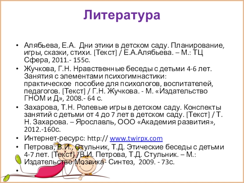 Жучкова, Г.Н. Нравственные беседы с детьми 4-6 лет. Занятия с элементами психогимнастики: практическое пособие для психологов, воспитателей, педагогов. [Текст] / Г.Н. Жучкова. - М. «Издательство ГНОМ и Д», 2008.- 64 с.
