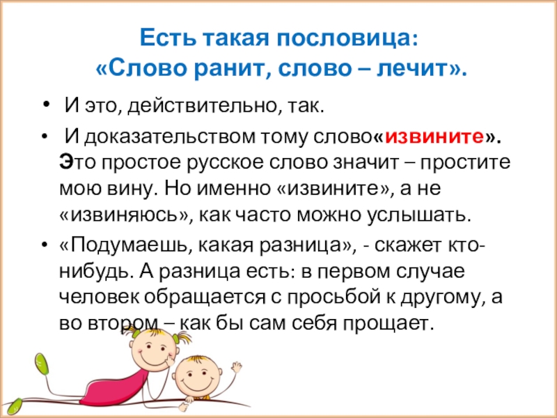 И доказательством тому слово«извините». Это простое русское слово значит – простите мою вину. Но именно «извините», а не «извиняюсь», как часто можно услышать.
