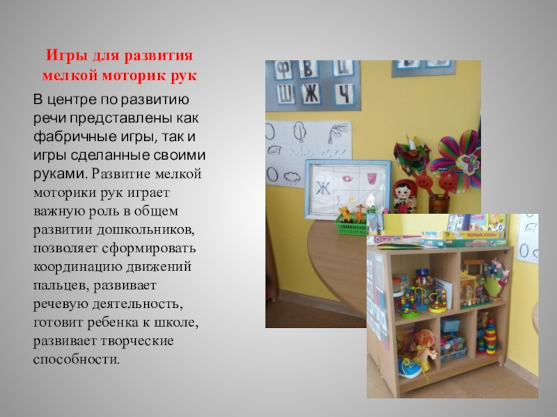 как фабричные игры, так и игры сделанные своими руками. Развитие мелкой моторики рук играет важную роль в общем развитии дошкольников, позволяет сформировать координацию движений пальцев, развивает речевую деятельность, готовит ребенка к школе, развивает творческие способности.