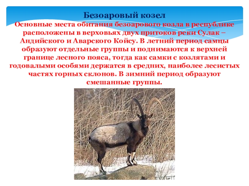 двух притоков реки Сулак – Андийского и Аварского Койсу. В летний период самцы образуют отдельные группы и поднимаются к верхней границе лесного пояса, тогда как самки с козлятами и годовалыми особями держатся в средних, наиболее лесистых частях горных склонов. В зимний период образуют смешанные группы.