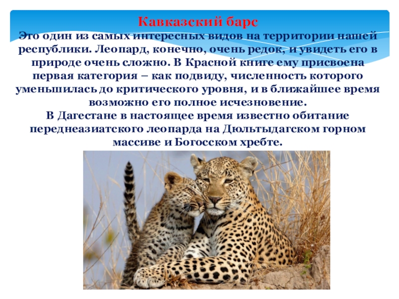 В Дагестане в настоящее время известно обитание переднеазиатского леопарда на Дюльтыдагском горном массиве и Богосском хребте.