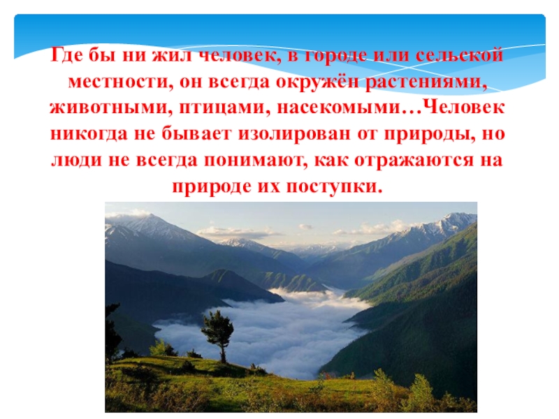 всегда окружён растениями, животными, птицами, насекомыми…Человек никогда не бывает изолирован от природы, но люди не всегда понимают, как отражаются на природе их поступки.