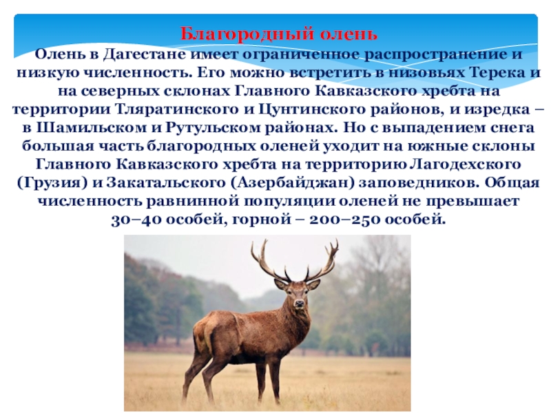 можно встретить в низовьях Терека и на северных склонах Главного Кавказского хребта на территории Тляратинского и Цунтинского районов, и изредка – в Шамильском и Рутульском районах. Но с выпадением снега большая часть благородных оленей уходит на южные склоны Главного Кавказского хребта на территорию Лагодехского (Грузия) и Закатальского (Азербайджан) заповедников. Общая численность равнинной популяции оленей не превышает 30–40 особей, горной – 200–250 особей.