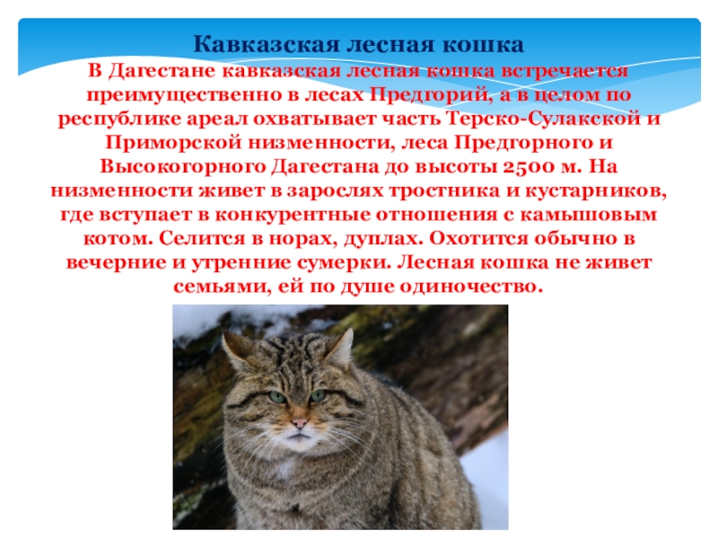 В Дагестане кавказская лесная кошка встречается преимущественно в лесах
