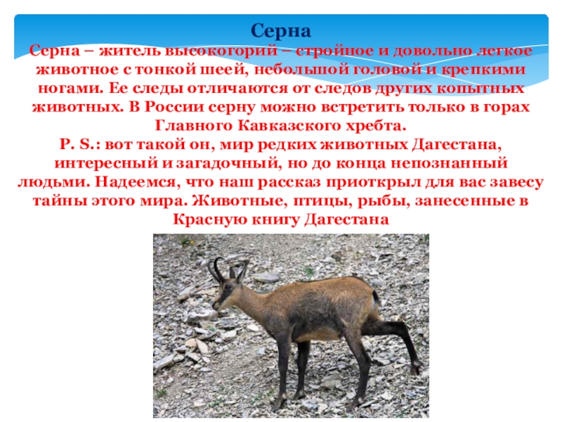 P. S.: вот такой он, мир редких животных Дагестана, интересный и загадочный, но до конца непознанный людьми. Надеемся, что наш рассказ приоткрыл для вас завесу тайны этого мира. Животные, птицы, рыбы, занесенные в Красную книгу Дагестана