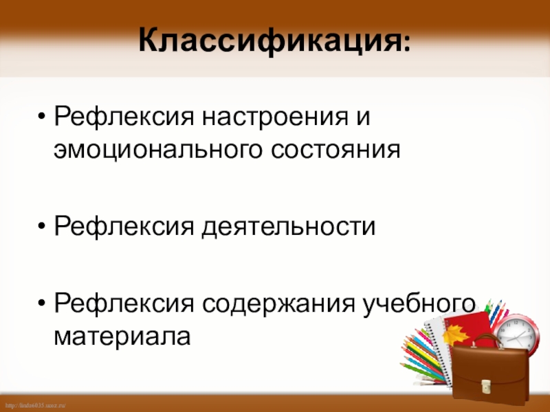 Классификация: Рефлексия настроения и эмоционального состоянияРефлексия деятельностиРефлексия содержания учебного материала