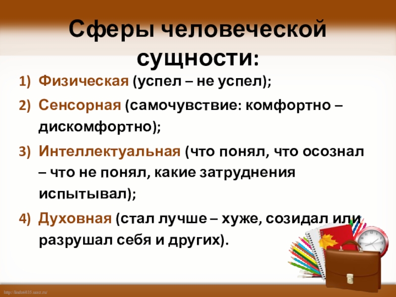 Сферы человеческой сущности:Физическая (успел – не успел);Сенсорная (самочувствие: комфортно – дискомфортно); Интеллектуальная (что понял, что осознал –