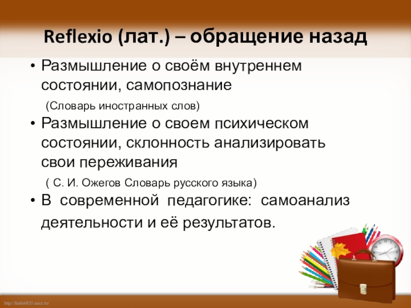 Reflexio (лат.) – обращение назад Размышление о своём внутреннем состоянии, самопознание (Словарь иностранных слов)Размышление о своем психическом состоянии, склонность анализировать свои переживания ( С. И. Ожегов Словарь русского языка)В современной педагогике: самоанализ