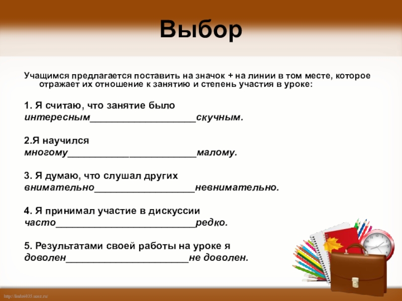 ВыборУчащимся предлагается поставить на значок + на линии в том месте, которое отражает их отношение к занятию