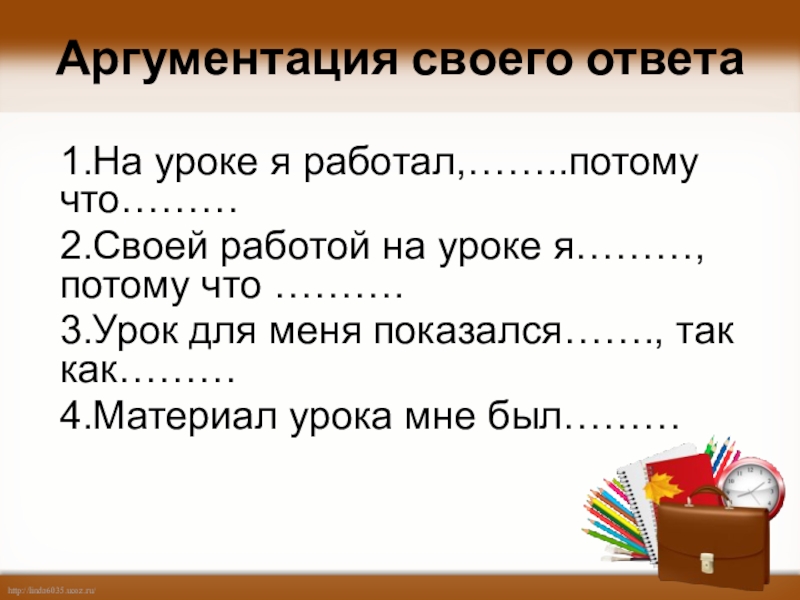 Аргументация своего ответа1.На уроке я работал,……..потому что………2.Своей работой на уроке я………, потому что ……….3.Урок для меня показался…….,