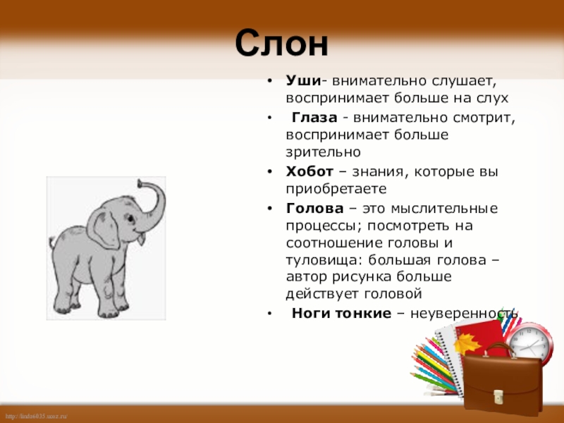 СлонУши- внимательно слушает, воспринимает больше на слух Глаза - внимательно смотрит, воспринимает больше зрительно Хобот – знания,