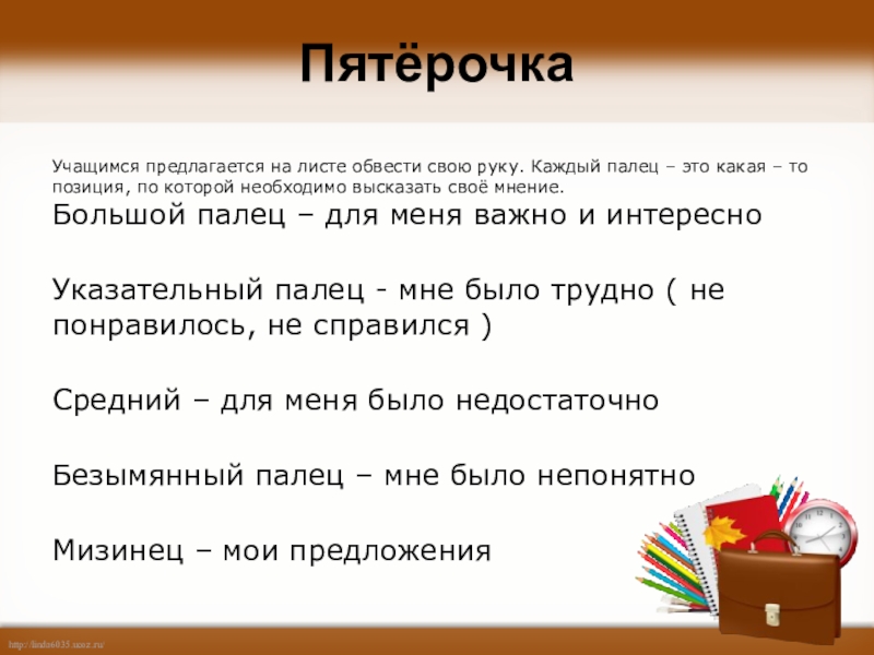 ПятёрочкаУчащимся предлагается на листе обвести свою руку. Каждый палец – это какая – то позиция, по которой необходимо