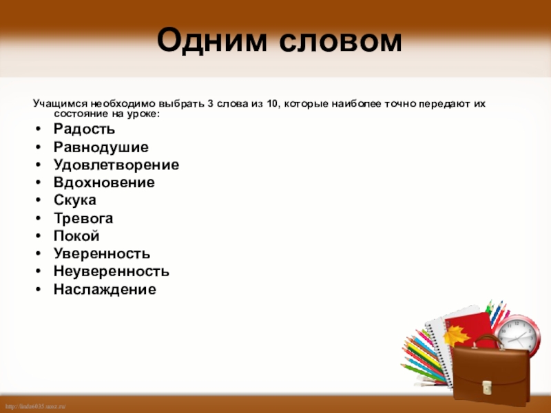 Одним словомУчащимся необходимо выбрать 3 слова из 10, которые наиболее точно передают их состояние на уроке:РадостьРавнодушиеУдовлетворениеВдохновениеСкукаТревогаПокойУверенностьНеуверенностьНаслаждение
