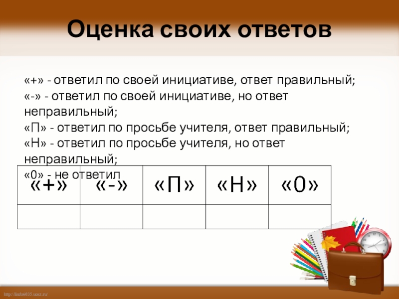 Оценка своих ответов«+» - ответил по своей инициативе, ответ правильный;«-» - ответил по своей инициативе, но ответ