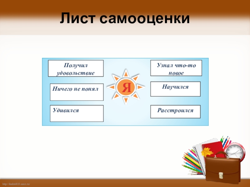 Лист самооценкиПолучил удовольствиеНичего не понялУдивилсяЯУзнал что-то новоеНаучилсяРасстроился