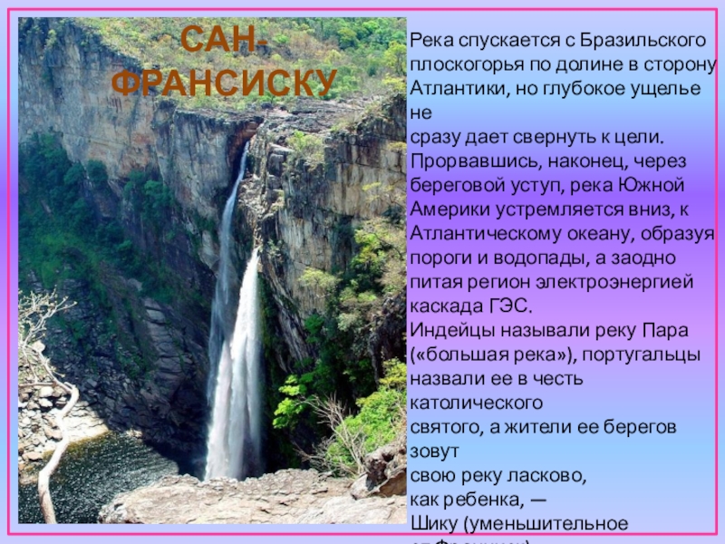 На языке индейцев гуарани слово «игуасу» означает «большая вода». Игуасу это имя реки в Южной Америке, а также каскада водопадов на этой реке и двух появившихся вблизи него уже в XX в. национальных парков — аргентинского и бразильского. Когда река Игуасу почти уже доходит,