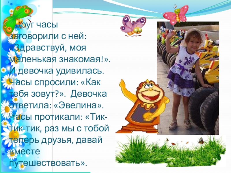 удивилась. Часы спросили: «Как тебя зовут?». Девочка ответила: «Эвелина». Часы протикали: «Тик-тик-тик, раз мы с тобой теперь друзья, давай вместе путешествовать».