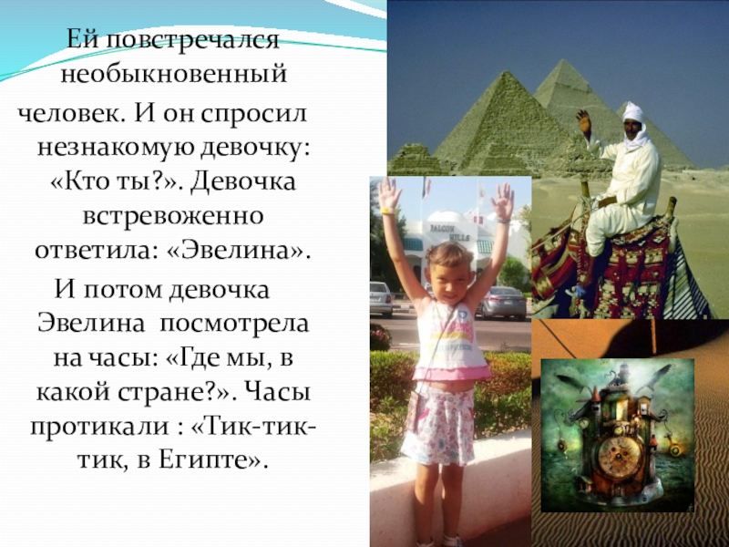 И потом девочка Эвелина посмотрела на часы: «Где мы, в какой стране?». Часы протикали : «Тик-тик-тик, в Египте».