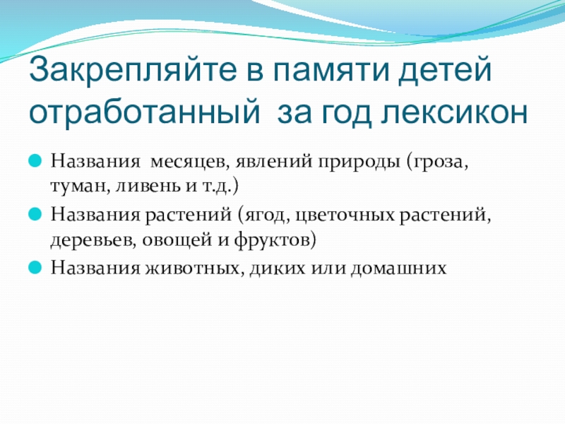 Слайд 9Закрепляйте в памяти детей отработанный за год лексикон