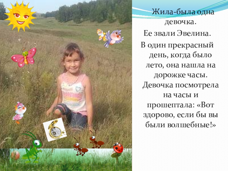 прекрасный день, когда было лето, она нашла на дорожке часы. Девочка посмотрела на часы и прошептала: «Вот здорово, если бы вы были волшебные!»