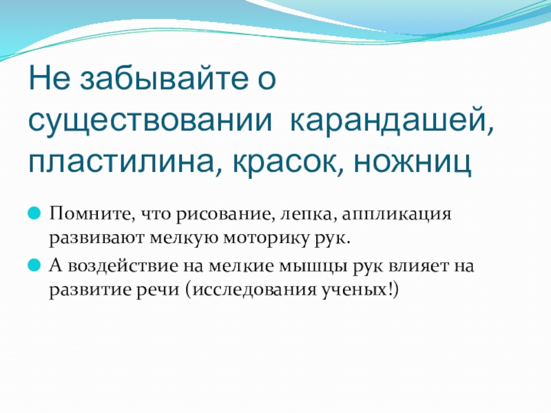 Слайд 20Не забывайте о существовании карандашей, пластилина, красок, ножниц