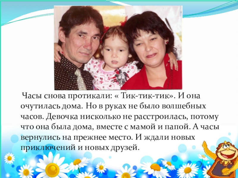 Но в руках не было волшебных часов. Девочка нисколько не расстроилась, потому что она была дома, вместе с мамой и папой. А часы вернулись на прежнее место. И ждали новых приключений и новых друзей.