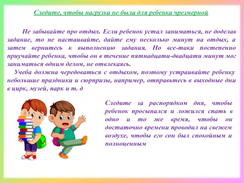 Следите за распорядком дня, чтобы ребенок просыпался и ложился спать в одно и то же время, чтобы он достаточно времени проводил на свежем воздухе, чтобы его сон был спокойным и полноценным