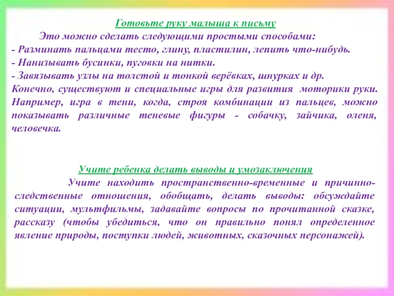следственные отношения, обобщать, делать выводы: обсуждайте ситуации, мультфильмы, задавайте вопросы по прочитанной сказке, рассказу (чтобы убедиться, что он правильно понял определенное явление природы, поступки людей, животных, сказочных персонажей).