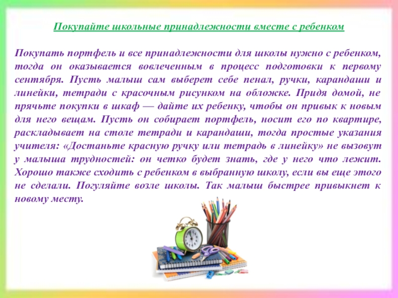 Важно сформировать у будущего школьника позитивное отношение к школе. Если ребенок хочет учиться и уверен, что в школе интересно, тогда неизбежный стресс, связанный с новыми правилами и распорядком дня, обилием незнакомых людей, будет успешно преодолен. Для этого чаще рассказывайте своему чаду забавные истории из своей школьной жизни.