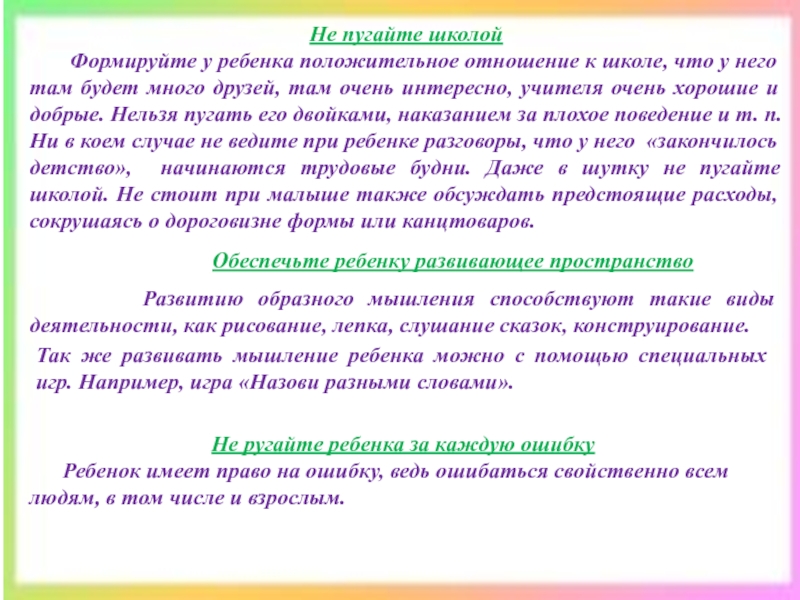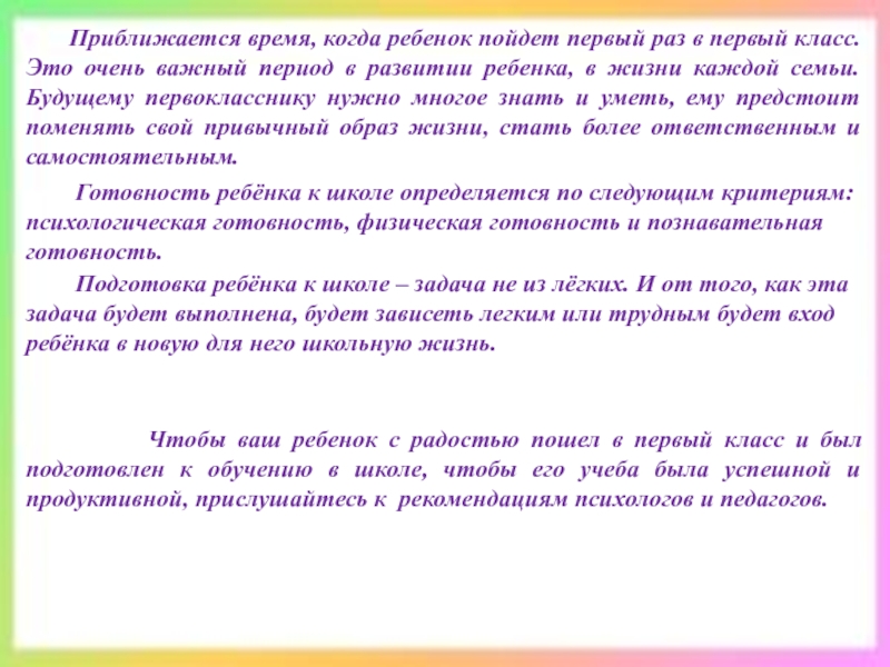 Чтобы ваш ребенок с радостью пошел в первый класс и был подготовлен к обучению в школе, чтобы его учеба была успешной и продуктивной, прислушайтесь к рекомендациям психологов и педагогов.