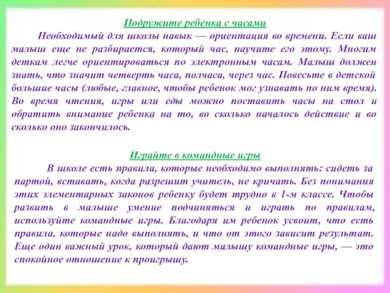 В школе есть правила, которые необходимо выполнять: сидеть за партой, вставать, когда разрешит учитель, не кричать. Без понимания этих элементарных законов ребенку будет трудно в 1-м классе. Чтобы развить в малыше умение подчиняться и играть по правилам, используйте командные игры. Благодаря им ребенок усвоит, что есть правила, которые надо выполнять, и что от этого зависит результат. Еще один важный урок, который дают малышу командные игры, — это спокойное отношение к проигрышу.
