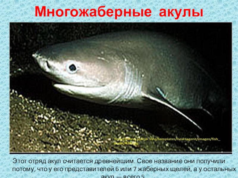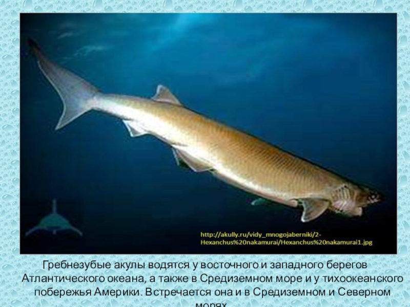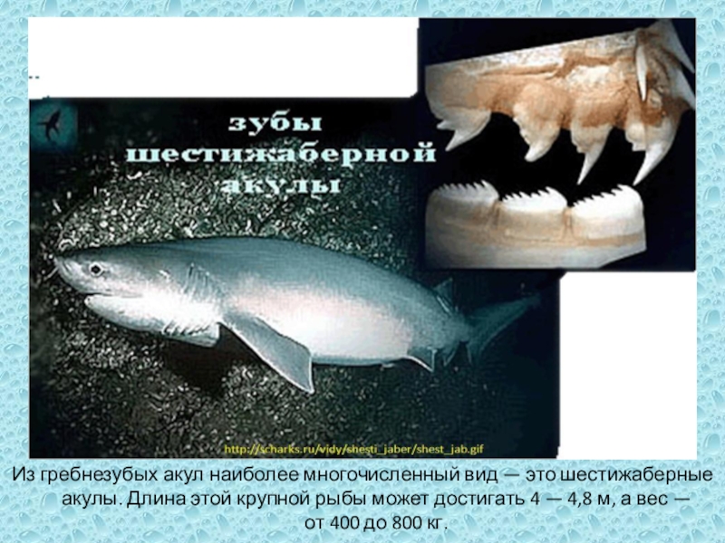 Слайд 24Из гребнезубых акул наиболее многочисленный вид — это шестижаберные акулы. Длина этой