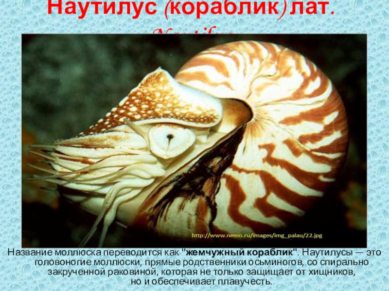 Слайд 9Название моллюска переводится как "жемчужный кораблик". Наутилусы — это головоногие моллюски, прямые