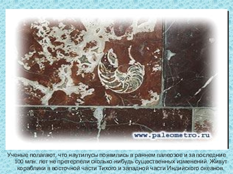 Слайд 12Ученые полагают, что наутилусы появились в раннем палеозое и за последние 100 млн. лет не претерпели