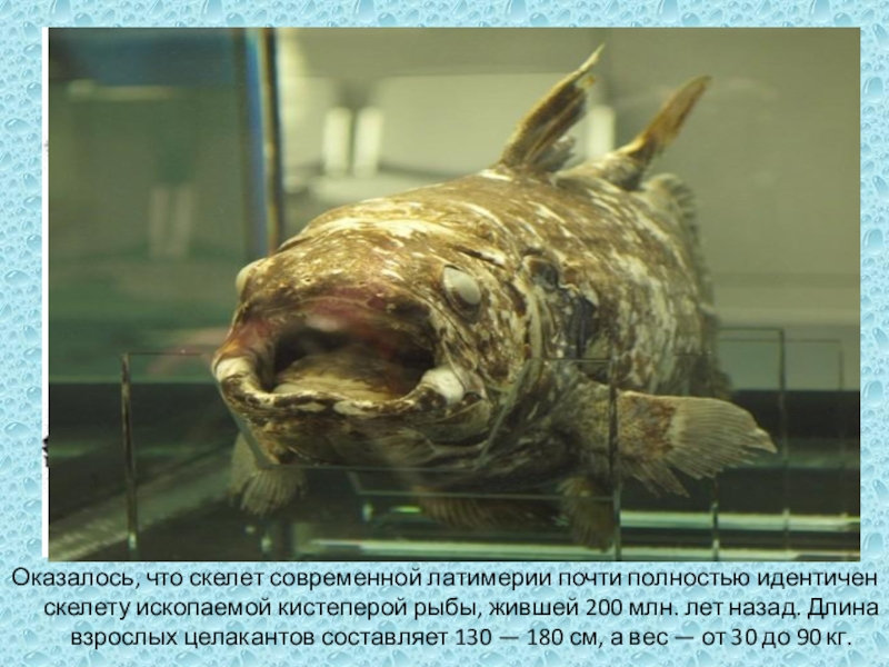 рыбы, жившей 200 млн. лет назад. Длина взрослых целакантов составляет 130 — 180 см, а вес — от 30 до 90 кг.