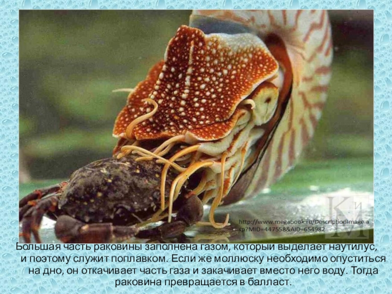 Слайд 11Большая часть раковины заполнена газом, который выделает наутилус, и поэтому служит поплавком.