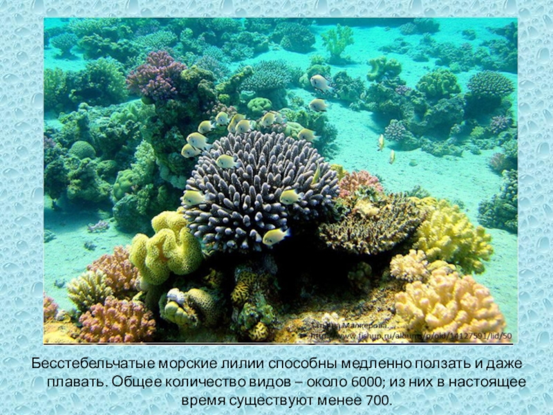 Слайд 7Бесстебельчатые морские лилии способны медленно ползать и даже плавать. Общее количество