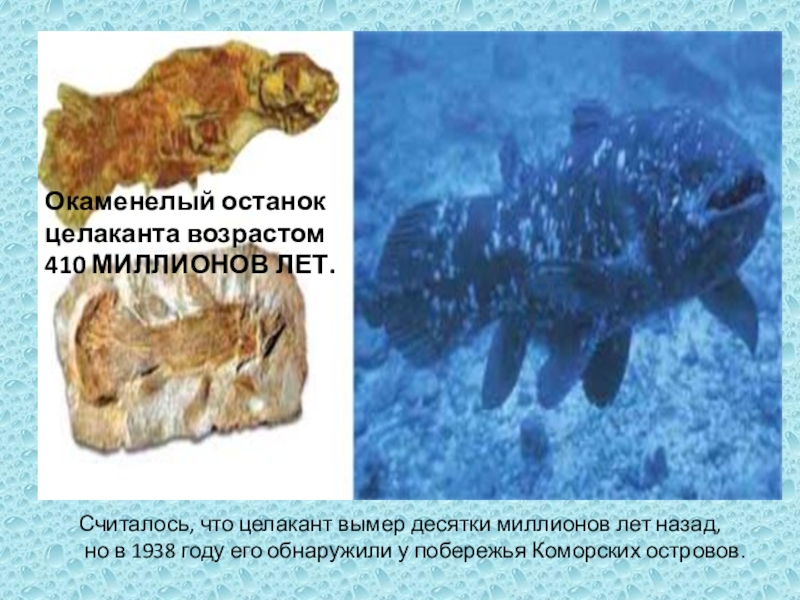 Слайд 19Считалось, что целакант вымер десятки миллионов лет назад, но в 1938 году его обнаружили