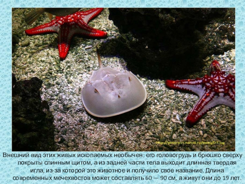 спинным щитом, а из задней части тела выходит длинная твердая игла, из-за которой это животное и получило свое название. Длина современных мечехвостов может составлять 60 — 90 см, а живут они до 19 лет.
