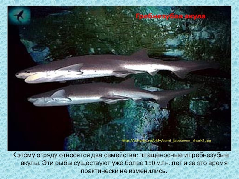 Слайд 22 К этому отряду относятся два семейства: плащеносные и гребнезубые акулы. Эти рыбы существуют
