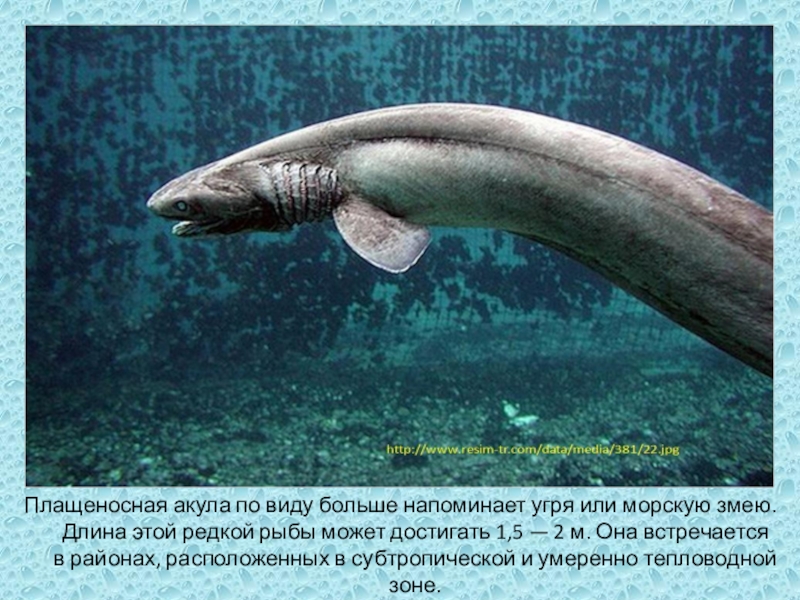 Слайд 23Плащеносная акула по виду больше напоминает угря или морскую змею. Длина этой