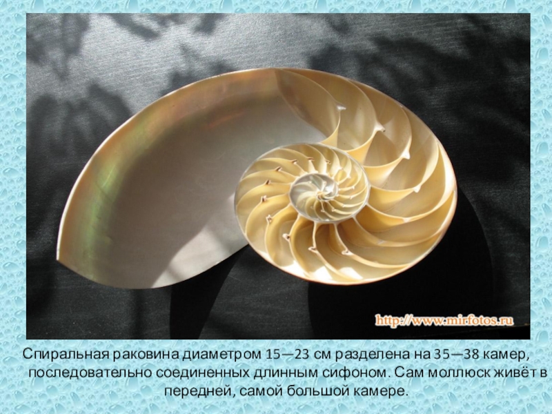 Слайд 10Спиральная раковина диаметром 15—23 см разделена на 35—38 камер, последовательно соединенных